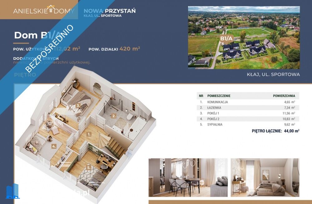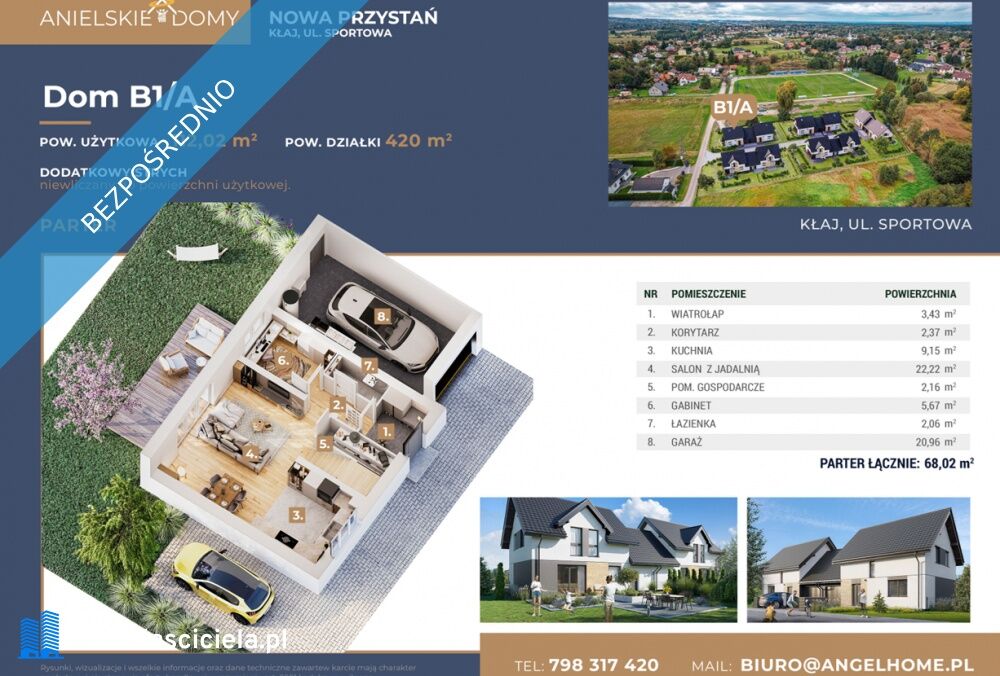 Oferuję do sprzedaży domy wolnostojące połączone garażami z dużymi, prywatnymi ogrodami, znajdujące się Kłaju, przy ulicy Sportowej.Osiedle "Nowa Przystań" w Kłaju to kameralna inwestycja dwóch domów jednorodzinnych dwulokalowych (łącznie 4 lokale)